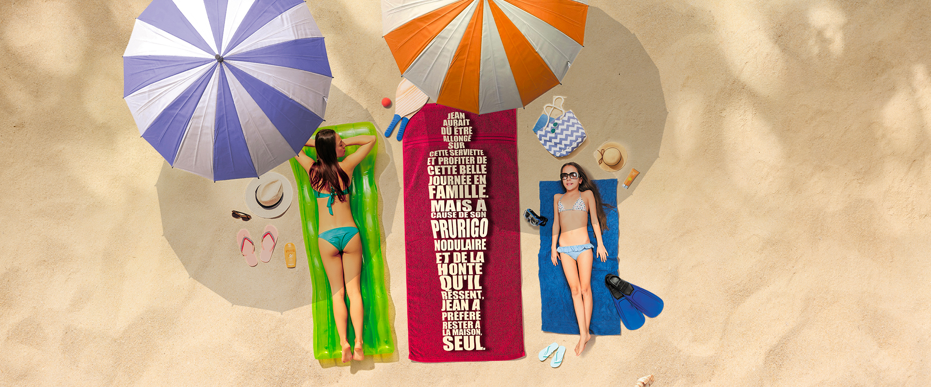La campagne, composée de trois visuels, représente des personnes atteintes de prurigo nodulaire qui, lors de moments de vie (journée à la plage, présentation en réunion ou soirée en boite de nuit), n’ont pas eu d’autres choix que de rester chez elles, seules. La campagne met en avant plusieurs aspects de la maladie : les démangeaisons intenses et sévères ressenties, l’isolement des personnes la honte perçue à travers le regard des autres